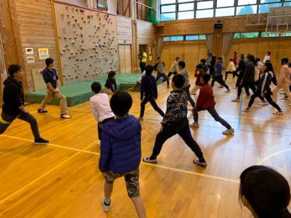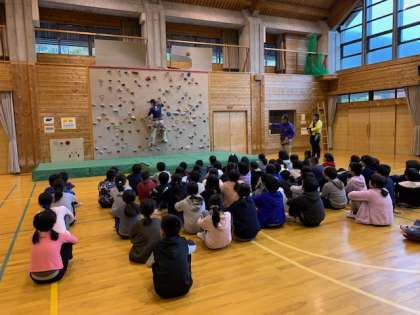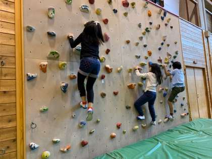 山の家の先生からボルダリング、クライミングの講習を受け、今からいよいよ挑戦です。準備運動もばっちりです。
