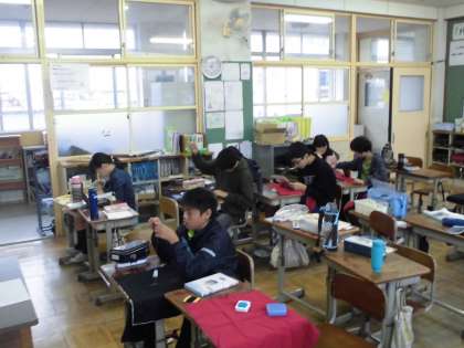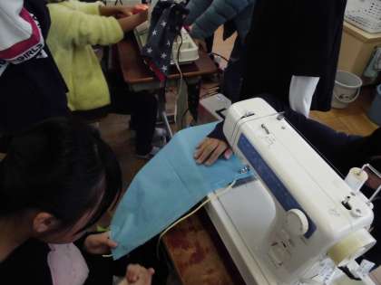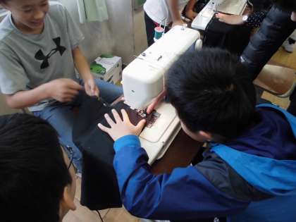 お弁当つつみを作っています。手縫いで仮縫いをしてからミシンで縫いました。子どもたちは丁寧に塗っていました。