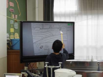 土地のつくりと変化の単元の学習に入りました。まず,子どもたちは土地のつくりがどのようになっているかについて予想をノートに記入しました。「土や岩などがあり,その下にはマグマがある。」「どろや岩盤があって下の方は押し固めれられて固くなっている。」等の予想を書いて発表しました。次に土地のつくりがわかる写真を見て気づいたことや疑問に思ったことを発表しあいました。