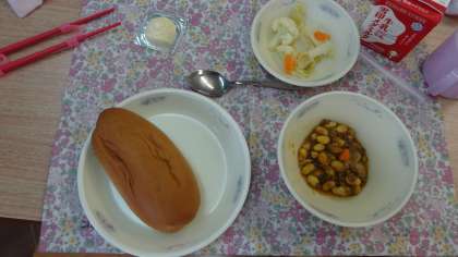 今日の献立は,「黒糖コッペパン・牛乳・チリコンカーン・カリフラワーのホットマリネ・チーズ」でした。1年生,おかわりで行列ができます。みんなしっかり食べるようになってきています。