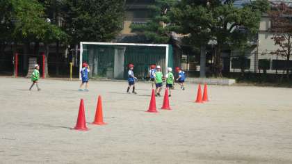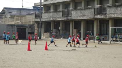ボールけりゲームの学習です。暖かい日差しの下で,みんな元気にボールを追いかけていました。