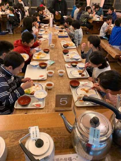 山の家の食堂での夕食にも,みんな慣れてきました。登山で疲れた分,おいしくいただいています。
