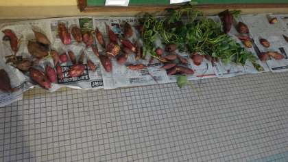 サツマイモを収穫です。大きなサツマイモも見られます。しばらく置いてから,焼き芋にしていただく予定です。今から楽しみです。