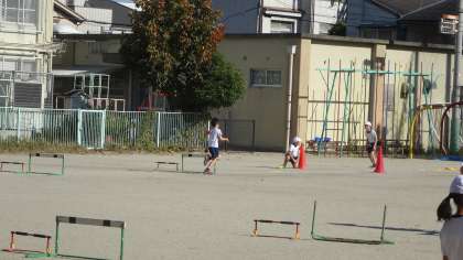 「ハードル走」の学習です。ハードルを越していくときに,どうしても恐怖心が出てしまう人もいるようですが,繰り返し練習しながら克服しています。