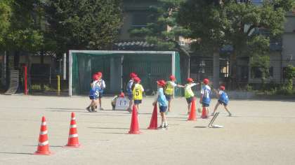 暖かい日差しの下でのボールけりゲームの学習です。2年生の元気な声が響いています。