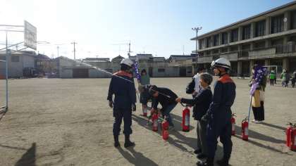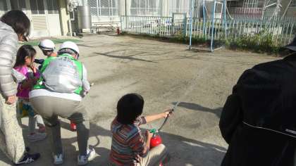 避難してきた町ごとに,まずは消火訓練です。本校の子どもたちも消火器を持たせてもらい,消防団の方々に教えていただきながら訓練しました。