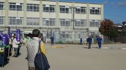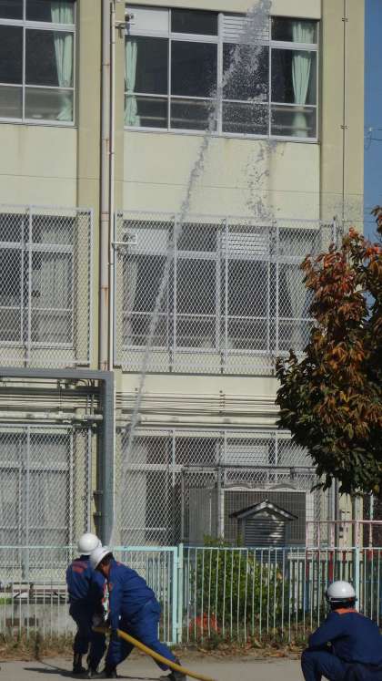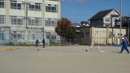 最後に,運動場で下鴨消防分団の方々による小型動力ポンプを使っての放水訓練をみんなで見守りました。