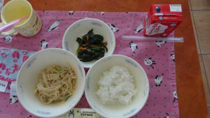 今日の献立は,「減量ごはん・牛乳・五目あんかけラーメン・ほうれん草のいためもの」でした。ラーメンは人気メニューです。具だくさんであたたまるメニューでした。