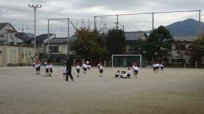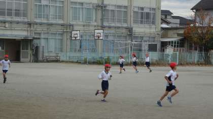 ジョギングを頑張っています。運動場に友だちを励ます応援の声が響いていました。