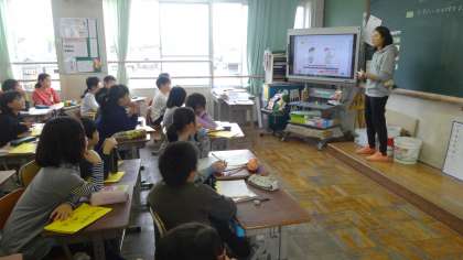 外国語活動の時間の様子です。先生にこれからインタビューに回りますが,インタビューの方法をみんなで確認しました。