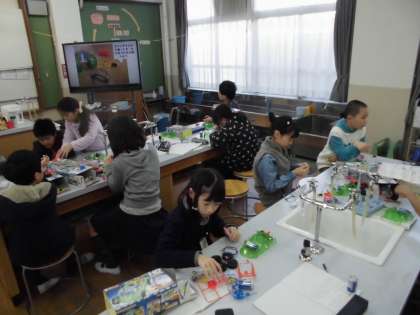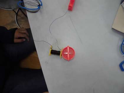 前の時間に作った電磁石ができたかどうかを確かめました。鉄のくぎがひきつけられるか調べたり,方位磁針の針がひきつけらるか調べたりしました。