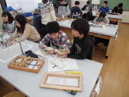 岩石標本を使ってれき岩,砂岩,でい岩の観察をしました。子どもたちはルーペを使って観察をして,ノートにまとめていました。