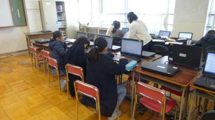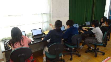 「絆」をテーマに,人と人とのつながりについて考えています。今日はコンピュータを使って調べ学習です。