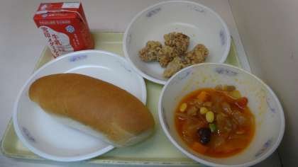 今日の献立は,「味つけコッペパン・牛乳・スパイシーチキン・ミネストローネ」でした。大人気メニューのスパイシーチキンは,鶏肉は柔らかく外はカリッと揚がっていておいしかったです。
