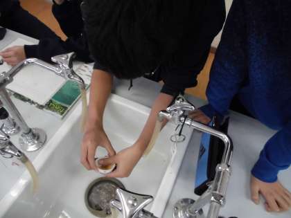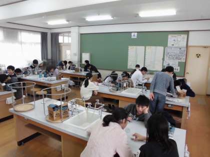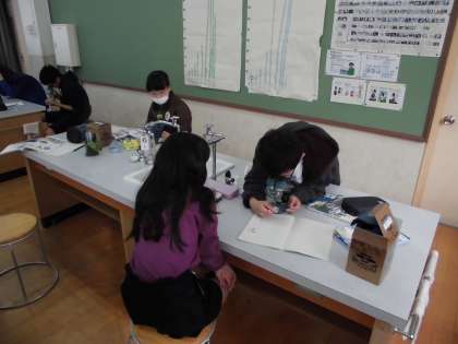 火山灰の観察をしました。約5万年前に鳥取県の大山火山の爆発で出された火山灰を実体双眼顕微鏡で観察しました。流れる水のはたらきでできた地層の粒とは異なり,火山灰には角張った粒があることを観察することができました。