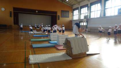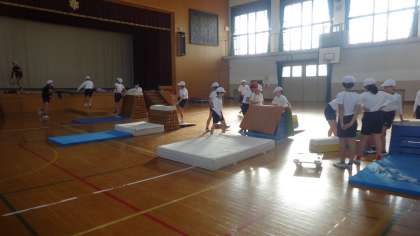 とびばこの学習の様子です。5年生では高さに挑戦したり,新しい技の獲得を目指して,各自でめあてをしっかりもって学習に取り組んでいます。場の準備も協力してすすめています。