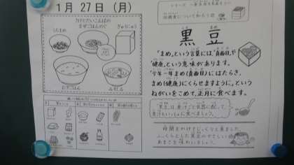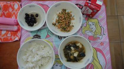 今日の献立は,「麦ごはん・牛乳・さけとだいこん葉のまぜごはん(具)・黒豆・みそ汁」でした。さけとだいこん葉はご飯との相性も良く,おいしくいただくことができました。