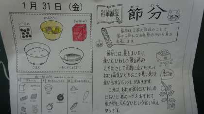 今日の献立は,「ごはん・牛乳・いわしのしょうが煮・関東煮・いり豆」でした。今日は節分献立の日でした。