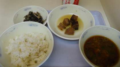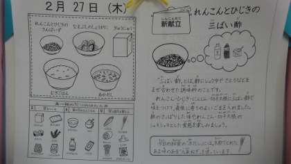 今日の献立は,「麦ごはん・牛乳・なま節のしょうが煮・れんこんとひじきの三杯酢・赤だし」でした。なま節はしょうがの味がよく効いていて,美味しかったです。