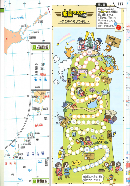 …と言ってもなかなか通じないかもしれないので何かないかなあ…と地図帳を見ていると,おもしろいものを発見しました!それは地図帳117ページにある「地図マスターへの道」です!地図帳の20ページから,ページのどこかにクイズがあり,それを達成できれば色がぬれる,といったゲーム式のものです!先生も少しやってみましたが,なかなかおもしろい!「○○をさがせ!」「どこからどこを指でなぞれ!」みたいなミッション形式で,早く次をやりたい!ってなります!…先生が小学生だったときもこんな地図帳があればよかったのに。
