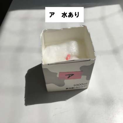 アには水が入れてあり,だっし綿がしめった状態になっています。イにはだっし綿のみで水が入っていない状態になっています。この2つは水がある,ないの条件のみを変えるのでそれ以外の条件である温度と空気の条件は同じにしておきます。どちらが発芽するかについてはホームページで様子をお伝えします