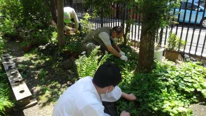 今年は下鴨神社内で規模を縮小した形で行うということで,飾り付けのために下鴨神社の方々と地域の方々でふたば葵を摘み取り奉納しました。