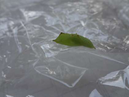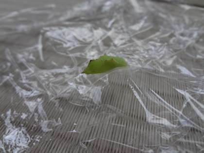 5月19日(火)・・・(一番上の写真です。)よく日には,体全体の形を変えていました。そうです。さなぎになったのです!さなぎは,黄緑色でラップにくっついてじっとしていました。大きさは,2センチメートル5ミリメートルくらいです。この中に,大人のモンシロチョウが入っているのでしょうか。。。。