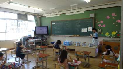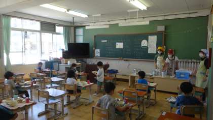 1年生にとって初めての給食。用意も先生にたくさん手伝ってもらいながら,みんなで頑張りました。今日はお魚で骨をとるのに苦労していましたが,おいしくいただきました。