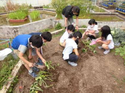学年の花壇には,サツマイモを植えました。秋にたくさんのサツマイモが収穫できるように,みんなで協力して植えていきました。秋の収穫を目指して,みんなで大事に育てていきます。