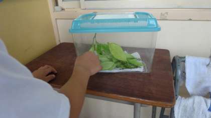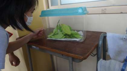 3年生の教室の前には虫かごが置かれています。その中を覗き込む3年生たち。何がいるのか,名前は,等々,いっぱい教えてくれます。これからも大事に見守っていきます。