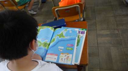校区の様子をみんなで調べ,校区地図にまとめてみました。自分たちの住む地域にはどんな特徴があるかつかめたようです。社会の時間に使う地図帳にも興味津々です。