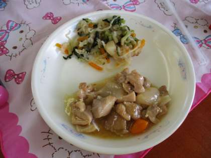鶏肉と人参,玉ねぎを炒めて味つけした「鶏肉の甘酢いため」は,