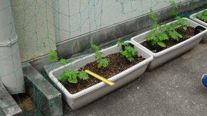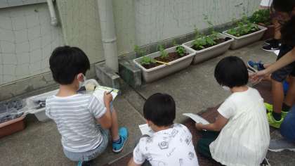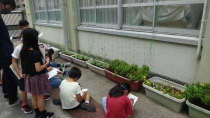 ツルレイシの観察に外に出てきた4年生。前時で学習した観察ポイントを意識して,ていねいに観察記録をとっていました。