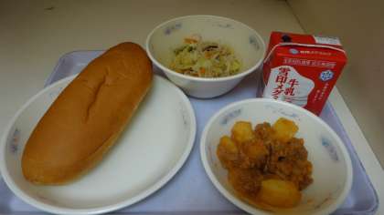 今日の献立は,「ミルクコッペパン・牛乳・豚肉のケチャップ煮・たっぷり野菜のビーフン」でした。具だくさんの献立で,食感も楽しみながら美味しくいただきました。