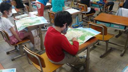 京都市の様子を学習しています。大きな京都市の地図も見ながら調べています。学習した東西南北も使いながら,何がどの方角にあるか,考えました。