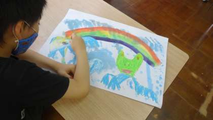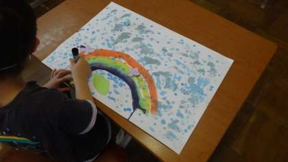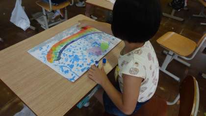 前回までに絵の具で絵を描きましたが,今日は色画用紙を切り絵にして貼っていきました。どんどんとカラフルに仕上がっていくので,みんな意欲的に取り組んでいました。