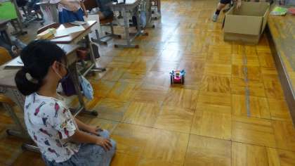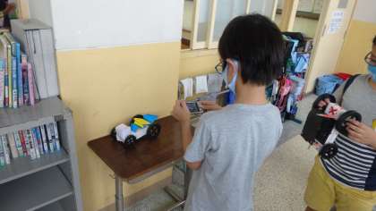 動くおもちゃが完成です。記念に自分の作品を写真におさめました。うまく動く様子も見せてくれました。