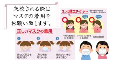 今回,ご来校いただくにあたり,保護者の皆様におかれましても,新型コロナウイルス感染拡大予防についてご理解・ご協力いただきますよう,よろしくお願い申し上げます。マスクの着用,上履きの持参と共に,校舎に入られましたら手洗いをお願い致します。各教室には消毒も置いていますのでご活用ください。なお,体調が優れない場合は,遠慮なさらずに申し出てください。宜しくお願い致します。