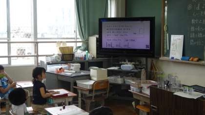 「かさ」の学習をしています。今日は新しく「ml(ミリリットル)」という単位を学習しました。リットルますもみながら,かさの感覚をつかんでいきました。