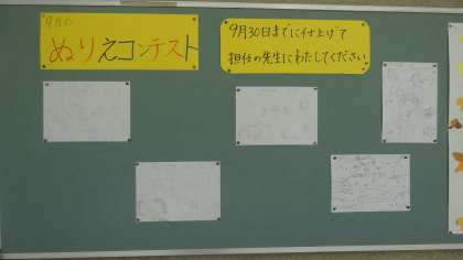 掲示委員会によるぬり絵コンテスト。秋バージョンです。早速に取り組んでいる人もいるようです。過ごしやすい秋がやってくるのが待ち遠しいです。