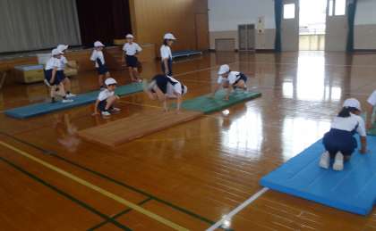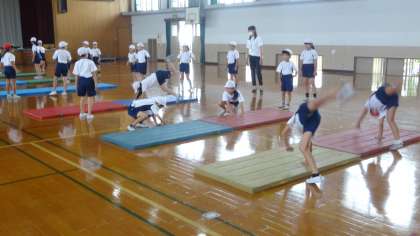 マット運動の学習がスタートしました。昨年までの学習を振り返りながら,体ならしをしっかりして技に挑戦していきます。今年はどんな技を獲得できるのでしょうね。楽しみです。