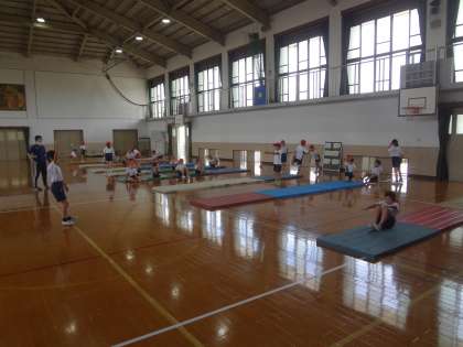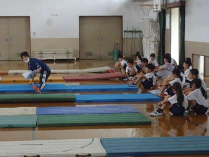 今週から,3年生はマット運動の学習が始まりました。前の時間に,どのようにマットを並べたり学習をしたりしていくのかということを学んでいます。今日は,班ごとにマットをていねいにならべて,自分のめあてにそって学習をしていきました。