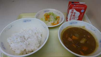 今日の献立は,「麦ごはん・牛乳・カレー・ソテー」でした。大人気メニューのカレー。ご飯にかけて,お腹いっぱいいただきました。