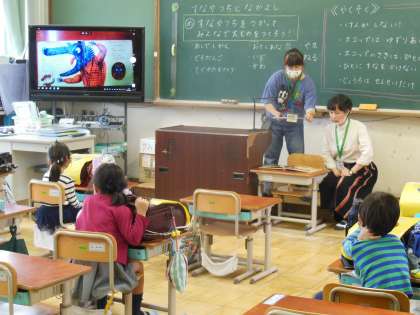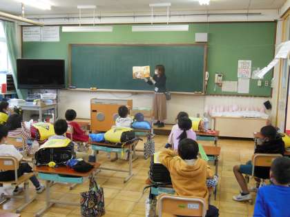 今日は1年生のお話の会でした。多くの子たちが参加する中,絵本をテレビに映すなどしながら読み聞かせをしてくださいました。子ども達も引き込まれながら真剣に聞いていました。