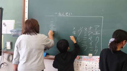 1年生は片仮名を,高学年は辞書を使っての漢字調べをしました。黒板をノート代わりにして,黙々と取り組んでいました。