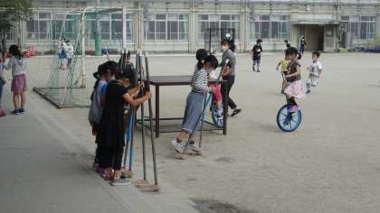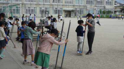 2週間,2年生の教室に教育実習生が来ていました。短期間で2年生の子たちとも関係が築けたようで,休み時間は竹馬をして楽しく一緒に過ごしていました。