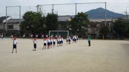 スポーツフェスティバルに向けて,1年生は運動場に出てきて練習です。広い運動場で,元気に取り組んでいました。