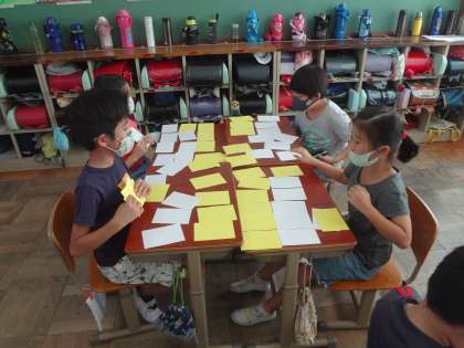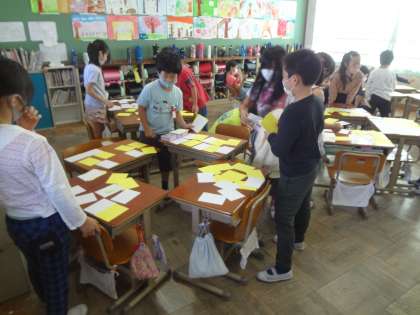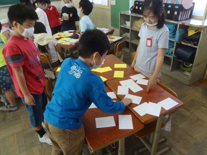 「へんとつくり」の学習です。漢字が,へんやつくりなどから構成されていることについて学習してきました。これまで学んできたことを生かして漢字のへんやつくりのカードをつくり,今日は班でへんとつくりのカード遊びを楽しみました。