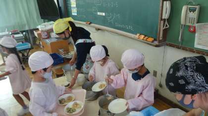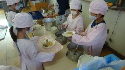 今日は1枚のお皿に2品を盛り付ける献立でした。1年生も2人で協力して配膳しています。