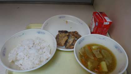 今日の献立は,「麦ごはん・牛乳・カレーあんかけ(具)・とびうおのこはくあげ」でした。あんのとろみとカレー風味がほど良くて,ごはんがよくすすみました。